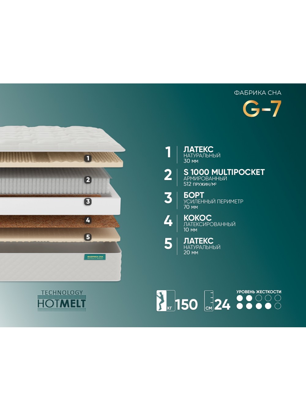 6. Евро периметр Система жесткого периметра матраса выполнена из пены высокой плотности. Располагается внутри матраса, создает идеальную форму его боковой части и дополнительно повышает жесткость краев, защищая их от проседания при нагрузках.
